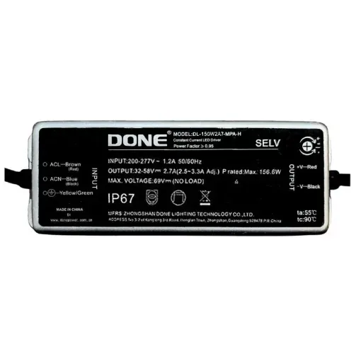Nguồn điện DONE công suất 150W (DL-150W2A7-MPA-H) là bộ driver LED dòng không đổi thuộc dòng nguồn công suất lớn của DONE, chuyên cấp điện ổn định cho chip LED công suất cao trong đèn pha LED, đèn đường LED, đèn nhà xưởng và đèn sân vận động. Model này được sử dụng nhiều nhờ độ bền cao, chịu điện áp rộng, chống nước tốt và hoạt động ổn định ngoài trời trong thời gian dài. Giá bán hiện tại trên thị trường dao động khoảng 830.000 VNĐ đến 1.130.000 VNĐ tùy đơn vị phân phối.