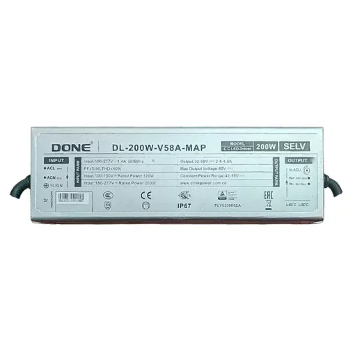 Nguồn điện DONE công suất 200W (DL-200W-V58A-MAP) là bộ driver LED công suất lớn thuộc dòng nguồn DONE chuyên dùng cho chip LED công suất cao trong các hệ đèn pha LED 200W, đèn đường LED, đèn nhà xưởng và đèn sân vận động. Model này được dùng phổ biến nhờ khả năng hoạt động ổn định liên tục, tải mạnh, điện áp đầu vào rộng và độ bền cao trong môi trường ngoài trời. Giá bán thực tế hiện dao động khoảng 765.000 VNĐ tùy đơn vị cung cấp.