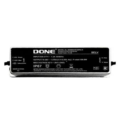 Nguồn điện DONE công suất 200W (DL-200W5A55-MPA-H) là bộ driver LED dòng không đổi thuộc dòng công suất lớn của DONE, chuyên cấp nguồn cho chip LED công suất cao trong các hệ đèn pha LED, đèn đường LED, đèn nhà xưởng và đèn sân vận động. Model này được dùng phổ biến vì khả năng tải lớn, hoạt động ổn định ngoài trời và chịu điện áp rộng, phù hợp công trình chiếu sáng liên tục nhiều giờ. Giá tham khảo hiện tại trên thị trường khoảng 670.000 VNĐ tùy đơn vị phân phối.