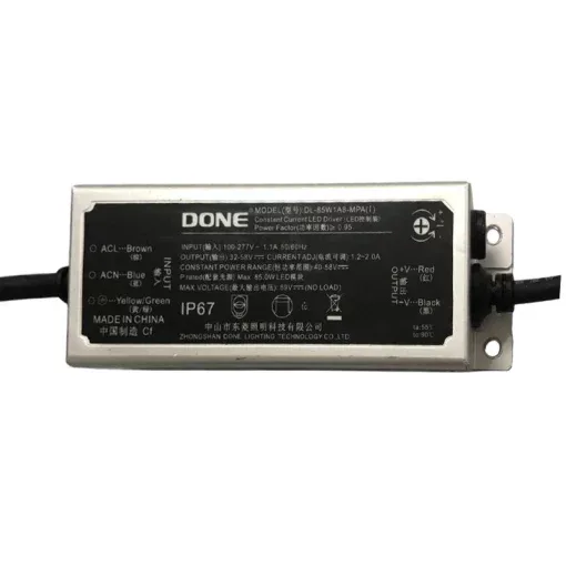 Nguồn điện DONE công suất 80W (DL-85W1A8-MPA) là bộ driver LED dòng không đổi chuyên dùng cho chip LED công suất cao, phù hợp cho đèn pha LED, đèn đường LED, đèn sân thể thao và đèn nhà xưởng. Model này được sử dụng nhiều vì hoạt động ổn định ngoài trời, hiệu suất cao, chịu điện áp rộng và có khả năng chống nước tốt. Theo thông số thực tế, nguồn dùng điện áp đầu vào 100–277VAC, điện áp đầu ra 32–58VDC, dòng ra 1.2–2.0A, công suất tối đa 85W và chuẩn bảo vệ IP67.